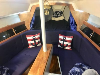 Encore is equipped with a main sail, headsail, 110 genoa, & a storm sail. She has a large house battery and inverter for 110 power. The galley has an alcohol fuel stove and pots/pans & dish-ware for cooking. Throw out the 33 lb anchor and row to shore to explore with a 12ft dinghy. *Note: anchor is pulled by hand, no windlass. For navigation, Navionics is integrated into our Garmin Navionics App is used for depth & navigation.